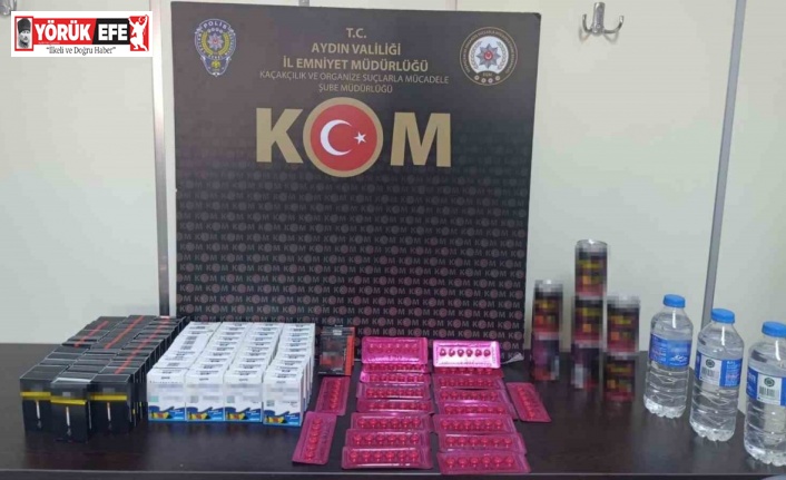 Aydın İl Emniyet Müdürlüğü ekiplerinin halk sağlığını tehdit eden ve vergi kaybına yol açan kaçakçılıkla mücadele çalışmaları aralıksız sürüyor. Edinilen bilgiye göre, Aydın İl Emniyet Müdürlüğü Kaçakçılık ve Organize Suçlarla Mücadele Şube Müdürlüğü ekipleri tarafından Köprülü Veysi Paşa Mahallesi Batı Gazi Bulvarı üzerindeki bir iş yerinde arama gerçekleştirildi. Yapılan aramada cinsel içerikli olduğu değerlendirilen 114 adet hap, 7 kutu içecek ve 280 adet jel ile 720 adet tütün doldurulmuş makaron ve 1,5 litre ev yapımı alkollü içki ele geçirildi. Olayla ilgili G.Ö. isimli şüpheli şahıs hakkında Kaçakçılıkla Mücadele Kanunu’na muhalefet suçundan adli işlem başlatıldı.