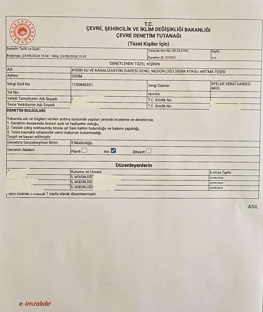 Konuyla ilgili olarak Aydın Büyükşehir Belediyesi tarafından yapılan açıklamada “Didim biyolojik atık su arıtma tesisi; çıkış suyu sürekli atık su izleme sistemi kullanılarak, Çevre Şehircilik ve İklim Değişikliği Bakanlığı ve İl Müdürlüğü tarafından sürekli kontrol edilen ve mer’i mevzuatın gerektirdiği tüm normları da karşılayan bir tesistir. Bu çerçevede; Çevre Şehircilik ve İklim Değişikliği Bakanlığı tarafından 23 Eylül 2024 tarihinde yapılan denetimde de herhangi bir olumsuzluğun olmadığı tespit edilmiş ve ayrıca denetim tutanağında da ifade edilmiştir. Arıtma tesisimizin çıkış suyu deşarj kriterlerine uygun olup herhangi bir olumsuzluk, mevzuata aykırılık kesinlikle söz konusu değildir” denildi.