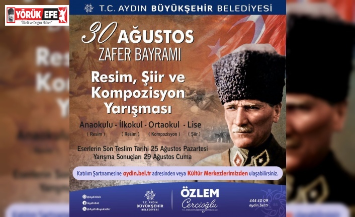 Aydın Büyükşehir Belediyesi, 30 Ağustos Zafer Bayramı nedeniyle ‘Zafer Bayramı’ temalı ödüllü resim, şiir ve kompozisyon yarışması düzenleyecek.