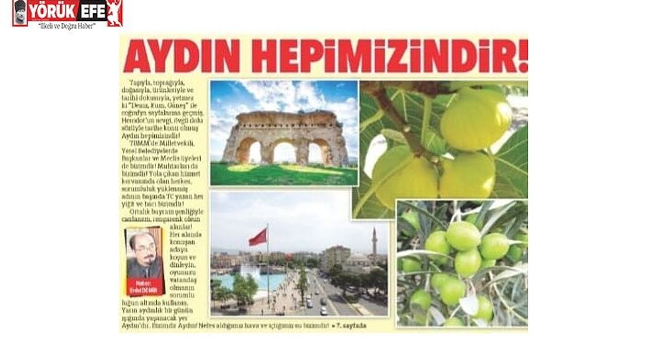 Taşıyla, toprağıyla, doğasıyla, ürünleriyle ve tarihi dokusuyla, yetmez ki ”Deniz, Kum, Güneş” ile coğrafya sayfalarına geçmiş, Herodot’un sevgi, övgü dolu sözüyle tarihe konu olmuş Aydın hepimizindir!