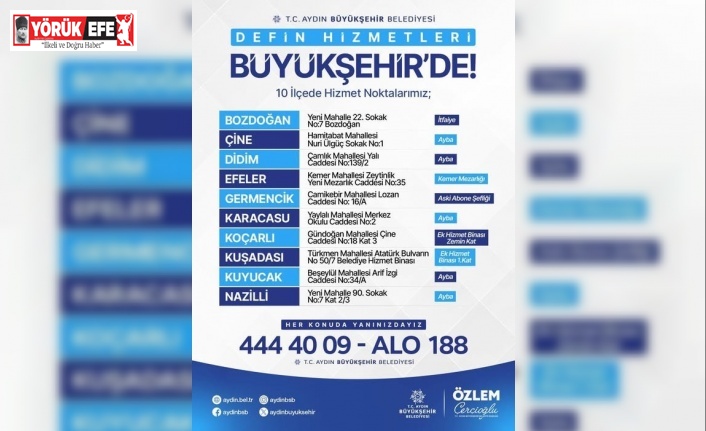 Aydın Büyükşehir Belediyesi’nden yapılan açıklamada, "Ocak 2026 Perşembe gününden itibaren 10 ilçemizde defin hizmetleri Büyükşehir Belediyemiz tarafından verilecektir. Defin Hizmet Ofislerimizden ve 444 40 09 ile 188 telefon numaralarımızdan bize ulaşabilirsiniz" denildi.