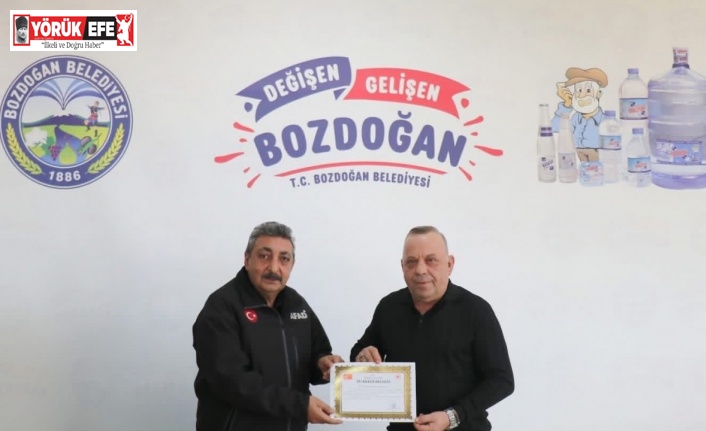 Aydın İl Afet ve Acil Durum İl Müdürü Yalçın Mumcu, Bozdoğan Belediyesi’ni ziyaret ederek teşekkür belgesini Başkan Özel’e takdim etti.