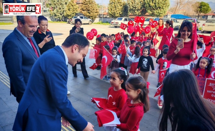 Aydın’ın Karpuzlu ilçesinde anaokulu öğrencileri, Türk bayrağına duydukları saygı ve sevgiyi sloganlarla dile getirerek Kaymakam Mustafa Bayram’a bayrak tesliminde bulundu.