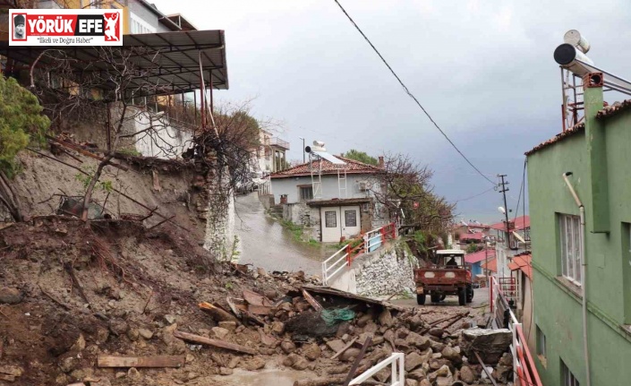 Aydın’ın Bozdoğan ilçesinde etkili olan sağanak yağış, Hisar Mahallesi’nde bir evin bahçe duvarının yıkılmasına neden oldu.