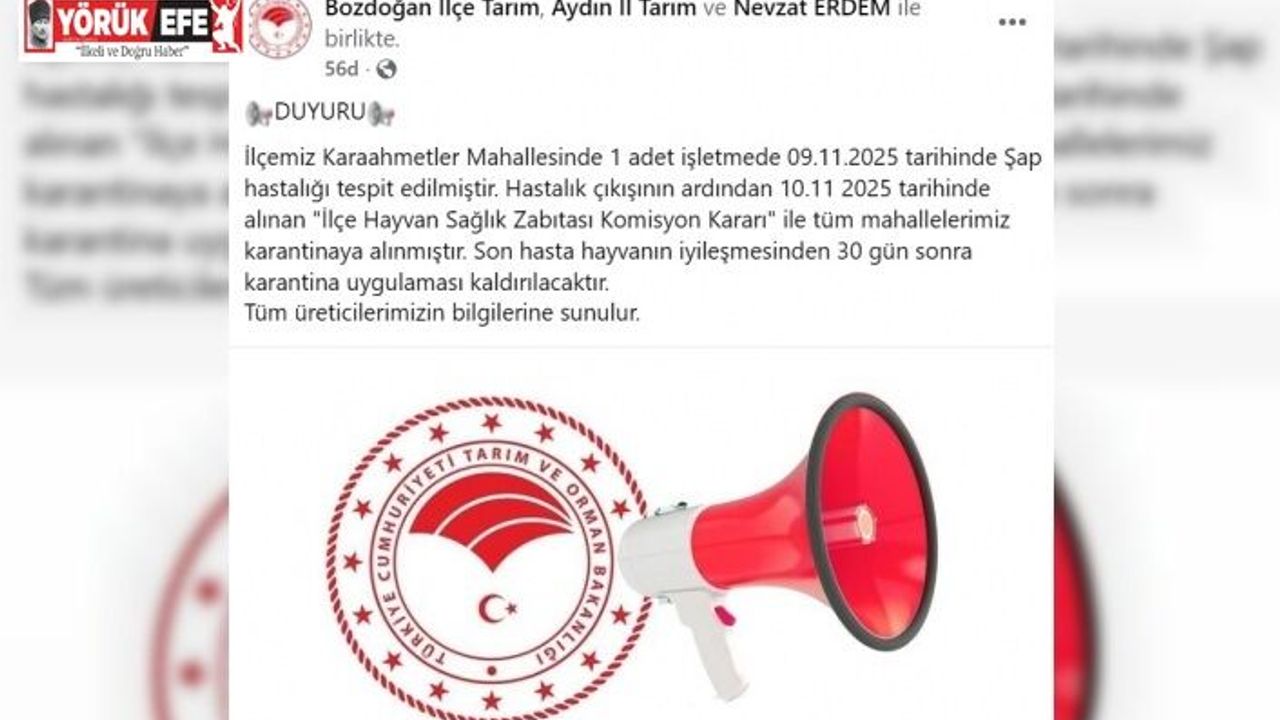 Bozdoğan İlçe Tarım ve Orman Müdürlüğü’nün sosyal medya hesabından yapılan açıklamada, 9 Kasım 2025 tarihinde Karaahmetler Mahallesi’ndeki bir işletmede şap hastalığının belirlendiği aktarıldı. Hastalık çıkışının ardından 10 Kasım 2025 tarihinde İlçe Hayvan Sağlık Zabıtası Komisyonu tarafından karar alındığı ve tüm mahallelerin karantinaya alındığı bildirildi. Açıklamada, karantina sürecinin titizlikle uygulanacağı, son hasta hayvanın iyileşmesinin ardından 30 günlük ek sürenin tamamlanmasıyla birlikte karantinanın kaldırılacağı ifade edildi.