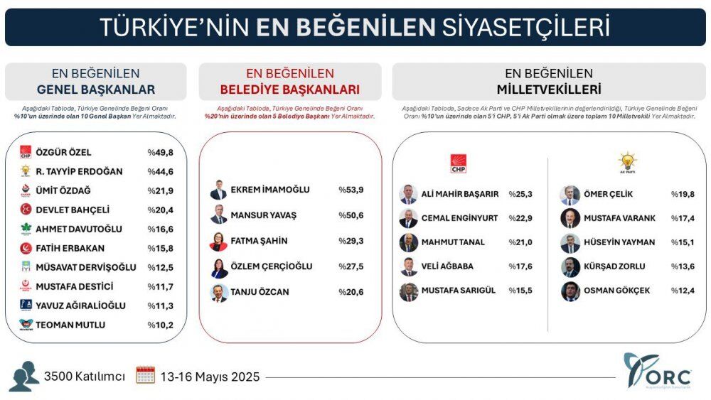 ORC Araştırması şirketi Türkiye'nin en beğenilen siyasetçiler listesini yayınladı.