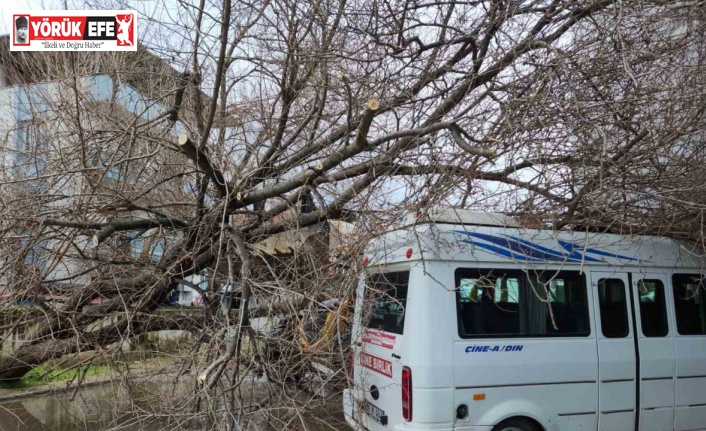 Aydın’ın Çine ilçesinde otogar içerisindeki dut ağacı yağışların ardında park halindeki bir minibüsün üstüne devrildi.
