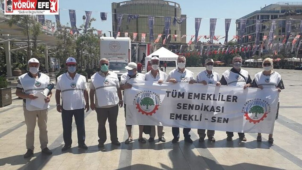 Türkiye’de eş zamanlı emekli maaşlarını sadaka diye itiraz eden kabul etmiyoruz diye direnen Tüm Emekliler Sendikası Genel Başkanlığı’na bağlı şube ve temsilciler tüm yurtta alanlara indi. Hükümetin Temmuz ayı için önerdiği sadaka zammını kabul etmediklerini belirten Tüm Emekliler Sendikası Şube ve Temsilcileri sendikal haklara dayalı masa başı yapılacak karşılıklı görüşmelerle insanca yaşam ve onurlu bir hayatın parçası olmak için bugünkü hükümetin emekli sendikalarına kapatma kararını ve Temmuz ayı sadaka zammını kabul etmiyoruz dediler. Aydın ili Tüm Emekliler Sendikası Şubesi Aydın Kent Meydanı’nda eş zamanlı basın açıklamasını okumadan önce Aydın ili Şube Başkanı Erdal Demir şunları söyledi;
