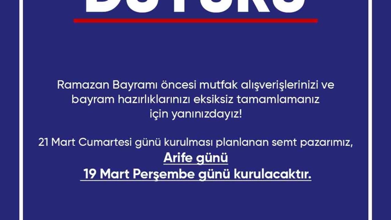 Didim Belediyesi tarafından yapılan duyuruda, normal şartlarda 21 Mart Cumartesi günü kurulması planlanan semt pazarının, Ramazan Bayramı arifesi olması nedeniyle 19 Mart Perşembe günü kurulacağı bildirildi. Belediye yetkilileri, yapılan düzenlemenin vatandaşların bayram hazırlıklarını daha rahat yapabilmesi amacıyla gerçekleştirildiğini belirtirken, pazarın arife günü hizmet vereceği ifade edildi.