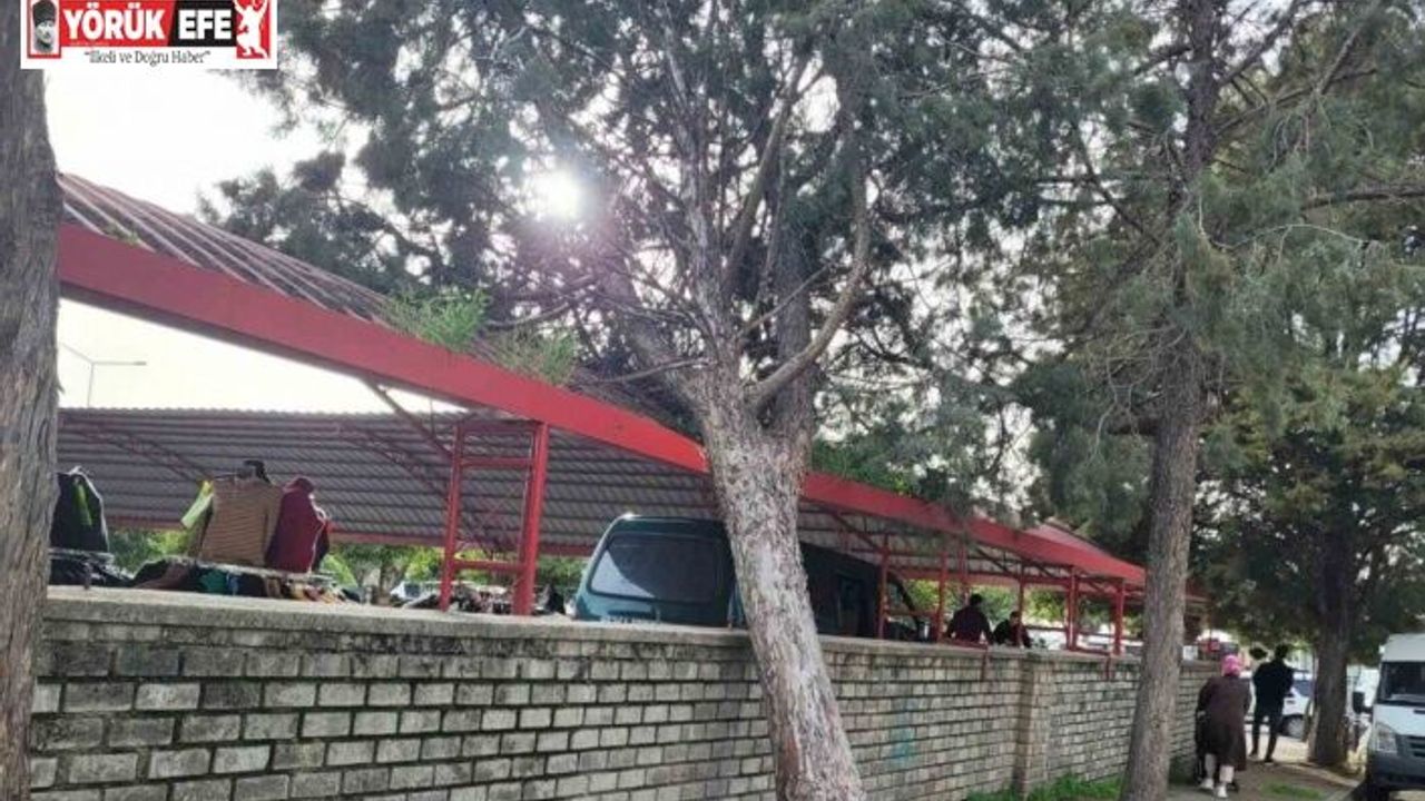 Aydın’ın Efeler ilçesinde şiddetli rüzgar nedeniyle devrilen ağaç pazaryeri duvarı ve satış alanındaki tentenin üzerine düşerek maddi hasara yol açtı.
