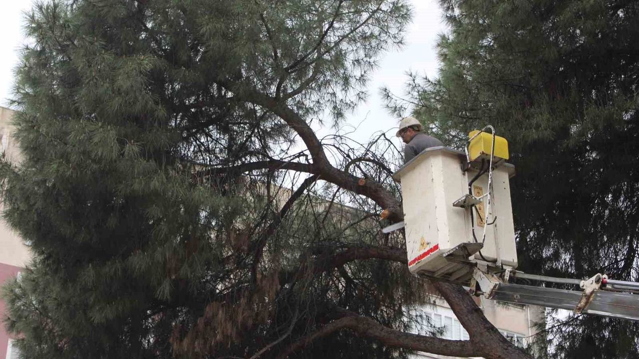 Aydın'ın Efeler ilçesinde etkili olan yağışların ardından 2 çam ağacı yan yatarken, ekiplerin hızlı müdahalesiyle ağaçlar devrilmeden budandı.