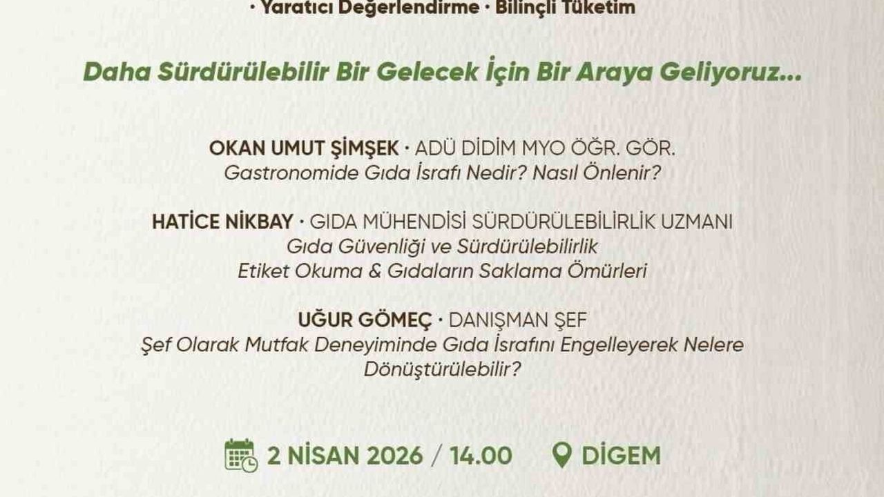 Didim Belediyesi, gıda israfına dikkat çekmek ve sürdürülebilir bir gelecek için toplumsal farkındalık oluşturmak amacıyla 'Geleceğe Bir Tabak Bırak' paneli düzenleyecek. Etkinlik, 2 Nisan 2026 Perşembe günü saat 14.00'te Didim Gençlik Merkezi'nde (DİGEM) gerçekleştirilecek. Etkinlik kapsamında katılımcılara, doğru gıda tüketimi, gıdaların sağlıklı saklama yöntemleri, mutfakta israfı önlemenin pratik yolları ve sürdürülebilir yaşam alışkanlıkları hakkında kapsamlı bilgiler sunulacak. Programda, 'Gastronomide Gıda İsrafı Nedir? Nasıl Önlenir?', 'Gıda Güvenliği ve Sürdürülebilirlik, Etiket Okuma ve Gıdaların Saklama Ömürleri', 'Mutfak deneyiminde gıda israfını engelleyerek nelere dönüştürülebilir?' konularında bilgi ve deneyimler paylaşılacak.