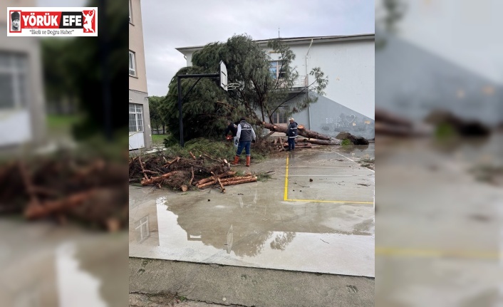 Aydın’ın Koçarlı ilçesine bağlı Bıyıklı Mahallesi’nde etkili olan şiddetli fırtına okul bahçesindeki yaklaşık 50 yıllık 5 çam ağacını kökünden söktü. Gece saatlerinde yaşanan olayda öğrencilerin okulda olmaması faciayı önlerken, sabah saatlerinde Koçarlı Belediyesi ekipleri devrilen ağaçları kaldırmak için çalışma başlattı.
