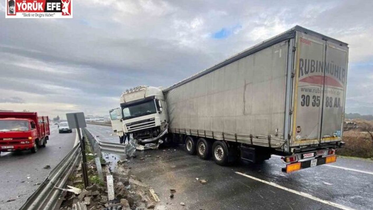Aydın-Denizli Karayolu’nda kontrolden çıkan tır, bariyerlere çarparak ters döndü. Kazada yaralanan olmazken, karayolu uzun süre trafiğe kapandı.