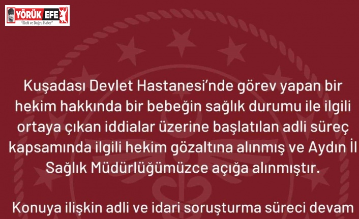İl Sağlık Müdürlüğü’nden yapılan açıklamada, "Kuşadası Devlet Hastanesi’nde görev yapan bir hekim hakkında bir bebeğin sağlık durumu ile ilgili ortaya çıkan iddialar üzerine başlatılan adli süreç kapsamında ilgili hekim gözaltına alınmış ve Aydın İl Sağlık Müdürlüğümüzce açığa alınmıştır. Konuya ilişkin adli ve idari soruşturma süreci devam etmekte olup, gelişmeler müdürlüğümüz tarafından hassasiyetle takip edilmektedir. Kamuoyuna saygıyla duyurulur" denildi.