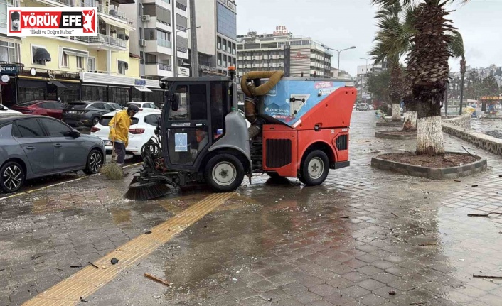 Kuşadası Belediyesi, dün kentte etkili olan sağanak ve fırtınanın ardından yağmur suyu ile taşan deniz sularının sahil bandına getirdiği mil ile çöp benzeri atıklara anında müdahale edip, temizledi.