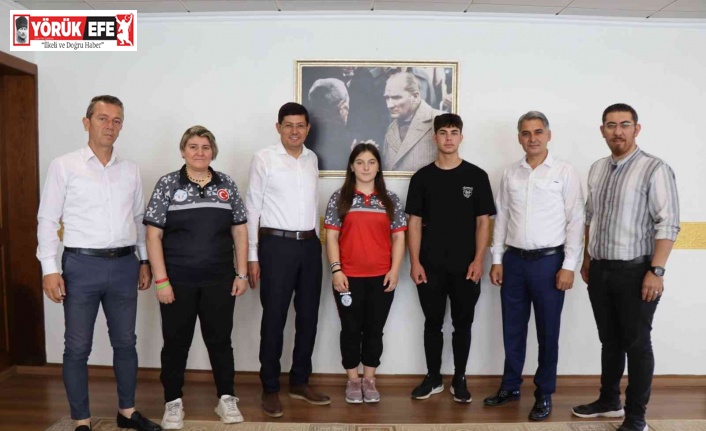 Nazilli Belediyespor’un şampiyon haltercileri Burcu İldem Gerçekten ve Ali Pınar, Belediye Başkanı Kürşat Engin Özcan’ı makamında ziyaret etti.
