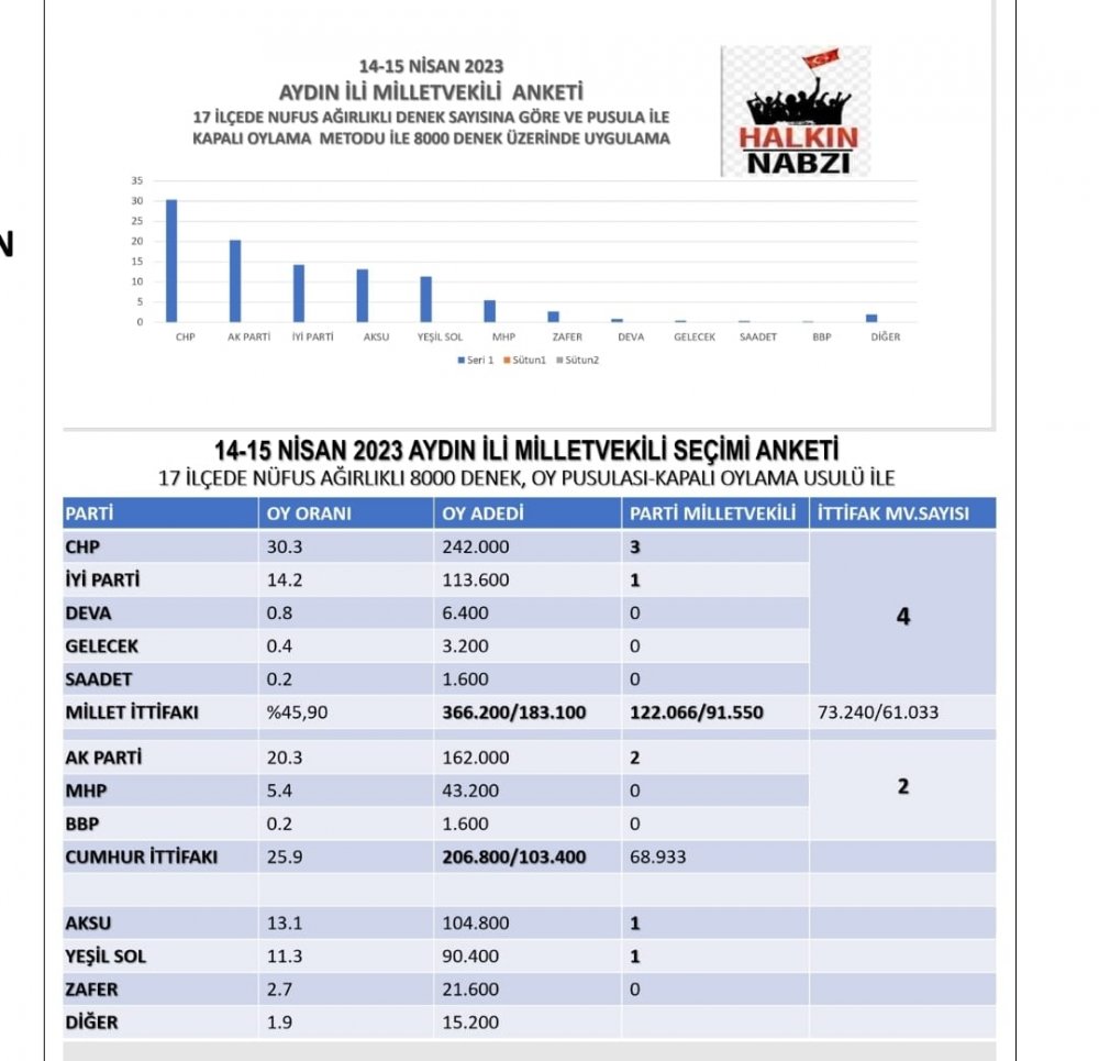 Ankette CHP ‘nin 3, AK Parti’nin 2, İYİ Parti’nin 1, Yeşil Sol Parti’nin 1 milletvekili çıkardığı görülüyor. Bu arada Bağımsız aday Aydın’ın eski belediye başkanı Hüseyin Aksu‘nun da partilerle yarıştığı ve seçilmesi için gerekli olan 80 bin oyun çok ötesinde oy alarak, 104 bin oyla milletvekili seçildiği görülüyor. Bu sonuç aslında halk arasında söylenenleri adeta doğruluyor.
