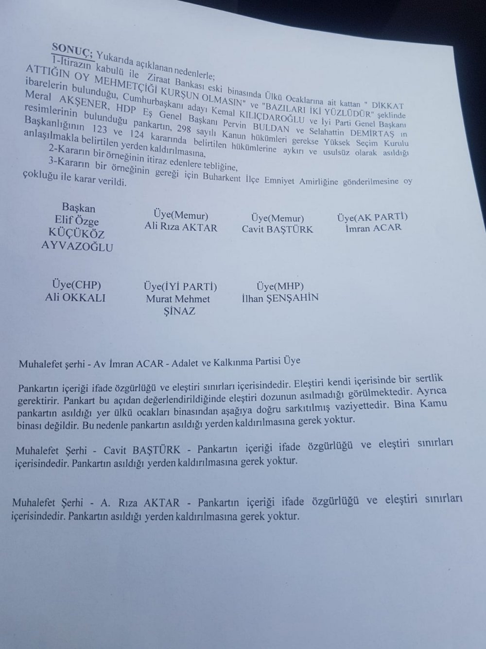 Buharkent Ülkü Ocakları’nın binaya astığı pankartın Buharkent İlçe Seçim Kurulu tarafından kaldırılmasına karar verildi.