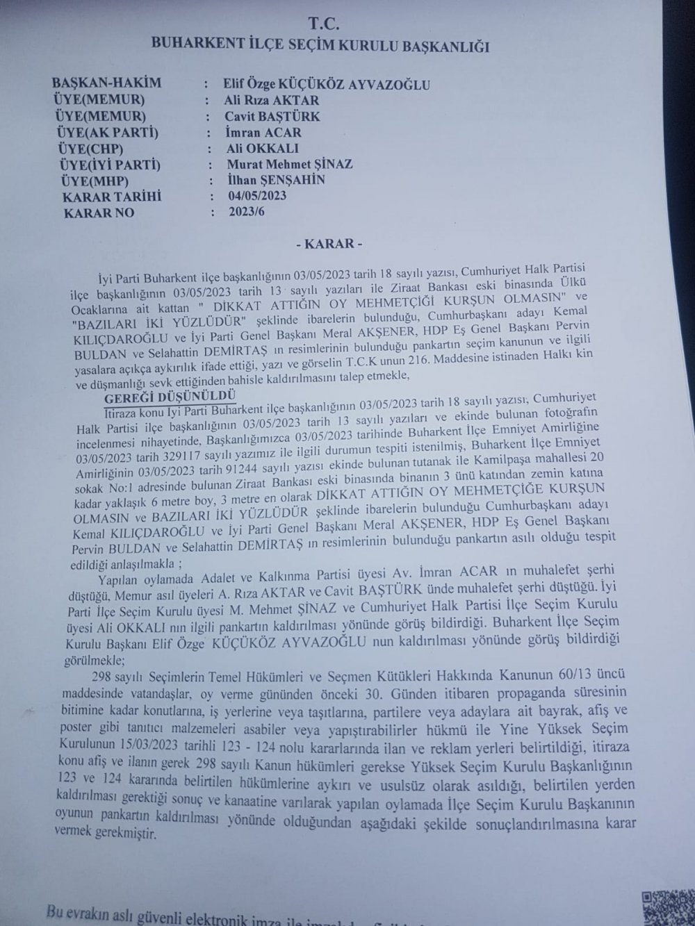 İyi Parti Buharkent İlçe Başkanı Serdar Kocakaya’nın şikayetini değerlendiren Buharkent Seçim Kurulu 13. Cumhurbaşkanı adayı CHP Genel Başkanı Kemal Kılıçdaroğlu, İyi Parti Genel Başkanı Meral Akşener, HDP Eş Genel Başkanı Pervin Buldan be Selahattin Demirtaş’ın fotoğrafının yer aldığı pankartın kaldırılmasına karar verdi.