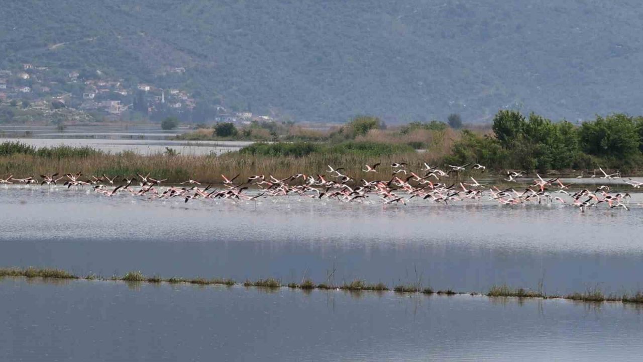 Son günlerde Aydın genelinde etkili olan sağanak yağışlar sebebiyle, uzun yıllar kuraklıkla mücadele eden Büyük Menderes Nehri'nde taşkınlar yaşandı. Aydın'ın ortasından kıvrılarak geçen ve Ege Denizi'ne dökülen nehrin su taşıması bir yandan üreticileri sevindirirken bir yandan da yaşanan taşkınlar sonucu birçok arazi sular altında kaldı. Adeta deniz gibi görünen tarlalar ise halk arasında allı turna olarak bilinen flamingoların beslenme noktası haline geldi. Söke ilçesine bağlı Bağarası Mahallesi yolu üzerindeki tarlaların misafiri olan flamingolar, görsel şölen oluşturdu. İlçenin sulak alanlarında yıllardır beslenen ve 'Söke Ovası'nın balerinleri' olarak nitelendirilen allı turnalar, suların kapladığı tarlalara indi. Balerin gibi süzülen flamingolar Söke Ovası'nda eşsiz manzara oluşturdu. İnce bacakları ve uzun boyunları ile tarlalarda balerin gibi süzülen flamingolar ise drone ile havadan görüntülendi. Görüntülerde flamingoların sular altındaki tarlalarda beslendiği görüldü.