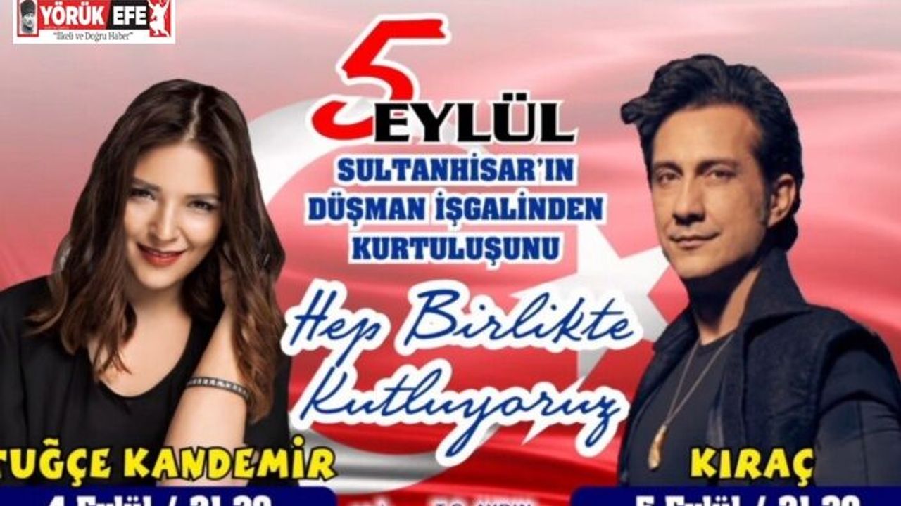 Sultanhisar’ın düşman işgalinden kurtuluşunun yıldönümü dolayısıyla gerçekleştirilecek olan etkinlikler için hazırlıklar sürüyor. Bu kapsamda Aydın Büyükşehir Belediyesi tarafından 4 Eylül’de Tuğçe Kandemir, 5 Eylül’de ise Kıraç konserleri gerçekleştirilecek. Kurtuluşun yıl dönümünü coşkuyla kutlayalım diyen Sultanhisar Belediye Başkanı Osman Yıldırımkaya ise tüm vatandaşları konsere davet etti.