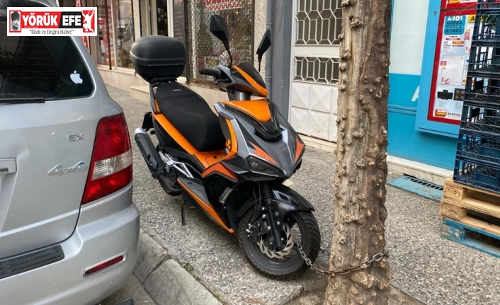 Aydın’da yaşayan bir vatandaş hırsızlara karşı motosikletini zincirle ağaca bağlayarak önlem aldı.
