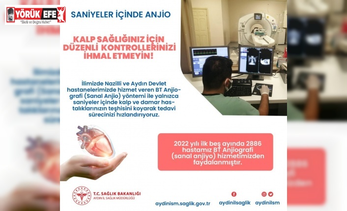 Konu ile ilgili Aydın İl Sağlık Müdürlüğü’nden yapılan açıklamada “İlimizde Nazilli ve Aydın Devlet hastanelerimizde hizmet veren BT Anjiografi (Sanal Anjio) yöntemi ile yalnızca saniyeler içinde kalp ve damar hastalıklarınızın teşhisini koyarak tedavi sürecinizi hızlandırıyoruz. 2022 yılı ilk beş ayında 2 bin 886 hastamız BT Anjiografi (sanal anjiyo) hizmetimizden faydalanmıştır” ifadelerine yer verildi.