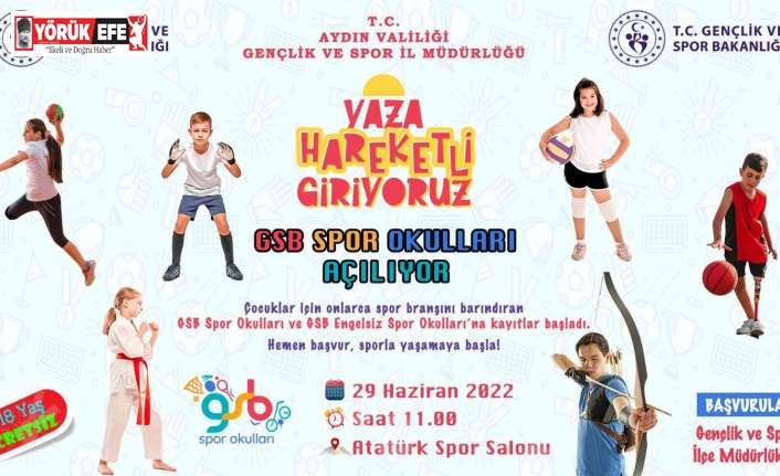 Gençlik ve Spor Bakanlığı (GSB) tarafından her yıl 81 ilde düzenlenen GSB Yaz Spor Okulları ve GSB Engelsiz Spor Okulları’nın; spora erişimi mümkün olmayan çocuk, genç ve özel birey kalmaması için 29 Haziran’da kapılarını açacağı belirtilirken, Aydın’da Yaz Spor Okullarına kayıtlar başladı.